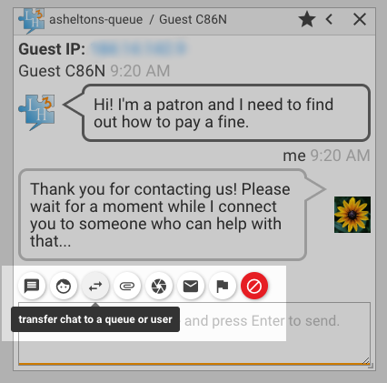 Or maybe your organization staffs the chat service in shifts. You might want to transfer a chat that has not reached a natural end yet. You can transfer a chat in progress to someone else so that the guest can continue to receive assistance from someone else when your shift is over.
