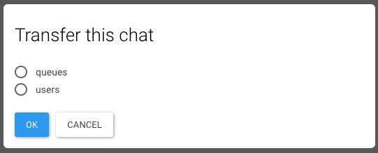 After the transfer button (shown above) is clicked, you'll see the chat transfer dialog.