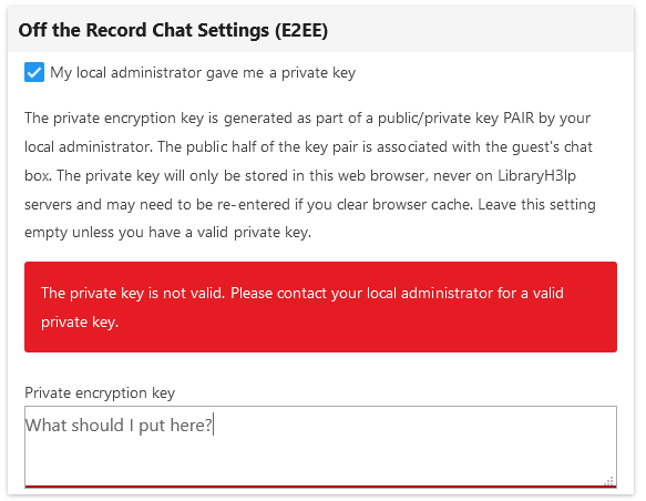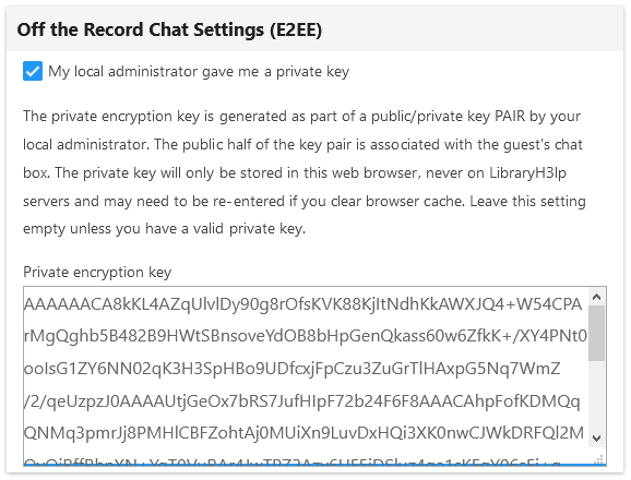 IMPORTANT: The private key is never stored on LibraryH3lp servers since doing so would defeat the purpose of the OTR/E2EE feature. The private key is only visible to the local administrator within that administrator's web browser and while the key generation screen is in view. Once the page refreshes, that particular private key is gone. Forever. It is the local administrator's responsibility to distribute the private key to all operators who answer chats from guests.